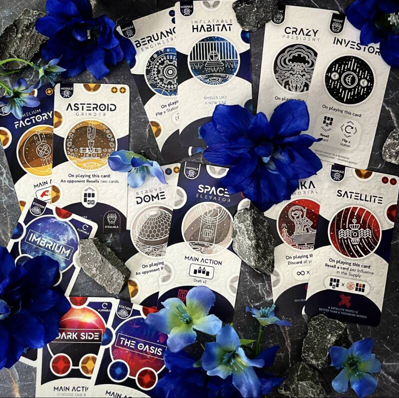 Each player is randomly given a Station card and his own Credit Counter, you start with three Credits. Shuffle the Module and Agent cards into a deck and place them face down on the table. Each player is dealt three cards from this deck in their hand. Then you place three cards plus 1 extra card per player face up on the table. The player who has made the longest trip in the last 30 days gets to start.
